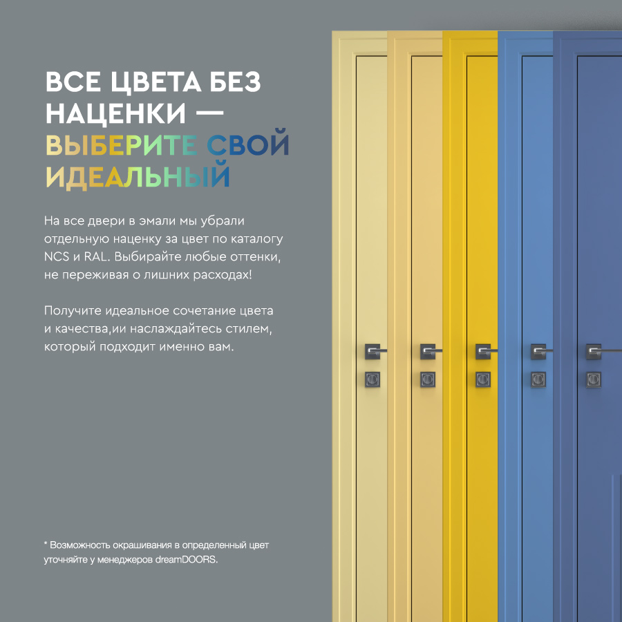 Пленка ПВХ толщиной 0,3 мм исключает мелкие повреждения на полотнах (в то время как часто используемая пленка толщиной 0,18 мм ведет к появлению сколов и потертостей). Также возможна покраска дверей в цвет по каталогу RAL